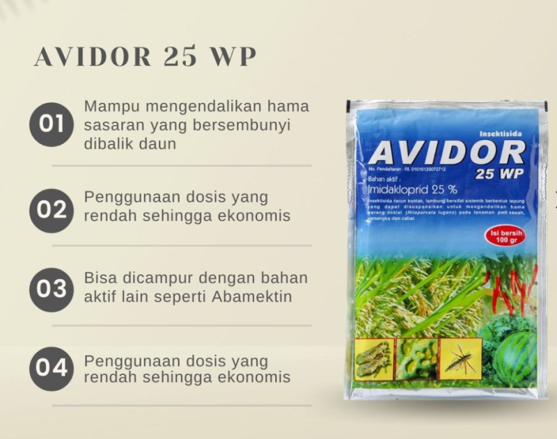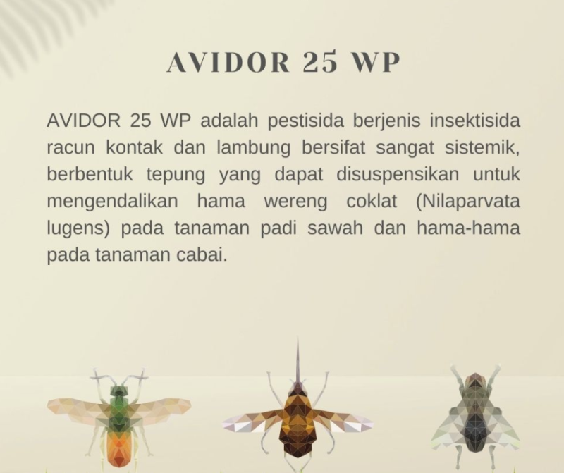 Avidor 25WP adalah pestisida berjenis insektisida racun kontak dan lambung bersifat sangat sistemik, berbentuk tepung yang dapat disuspensikan untuk mengendalikan hama wereng coklat (Nilaparvata lugens) pada tanaman padi sawah dan hama-hama pada tanaman cabai. Hama wereng batang coklat (WBC) merupakan hama utama tanaman padi sehingga menjadi hama yang sangat ditakuti petani karena bisa mengakibatkan gagal panen (fuso).