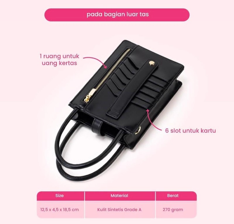 - 1 tali pendek yang menyambung pada tas digunakan sebagai Hand bag