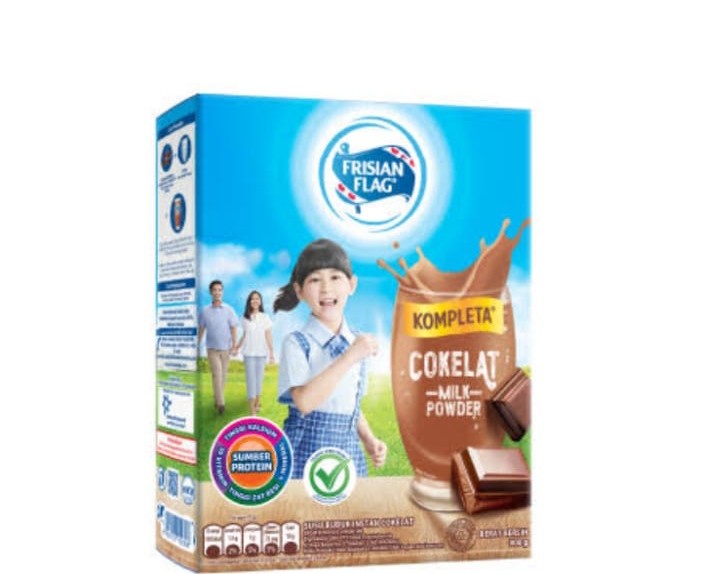 Susu Bubuk Frisian Flag KOMPLETA Cokelat diproduksi menggunakan susu bubuk berkualitas dengan kandungan zat gizi makro (protein, karbohidrat dan lemak) dan tinggi Kalsium, Tinggi Zat Besi, Sumber Protein, 10 Vitamin dan 4 Mineral dan mudah dilarutkan karena berada dalam bentuk instant.