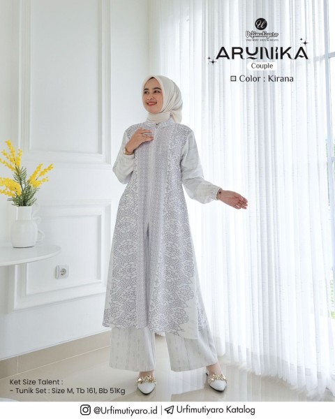 Arunika Tunik didesain dengan aksen slit di bagian depan dengan kerah model shanghai, akses opening menggunakan zipper di depan, sehingga Arunika Tunik ini busui friendly.dipairingkan dengan Pants yang didesain dengan cutting kulot.